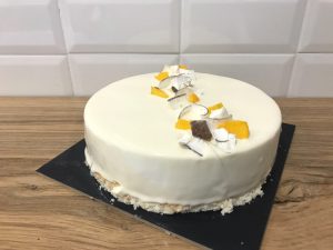 Il regno del bianco - Mousse bianca al cocco, cioccolato bianco e vaniglia; gelèe al passion fruit; dacquoise di mandorla e cocco… e per non farci mancare niente: decorazione di cocco.