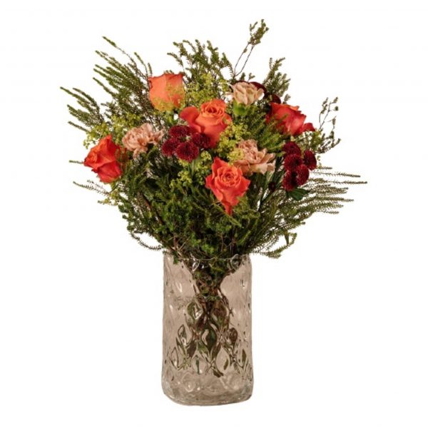 Bouquet sui toni dell'arancio con: rose arancio, bottoncini rossi, garofani caramel, erica verde. Ideale per un regalo speciale.
