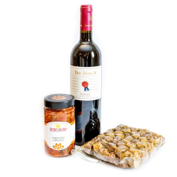 Un momento di gustosa convialità in famiglia, tra amici o colleghi. Sfiziose olive di "Nocellara", una deliziosa e ricca caponata, il tutto accompagnato con un vino rosso speziato e caldo che conserva i profumi di una ricca terra. Clicca Aggiungi e Scegli la variante che preferisci.