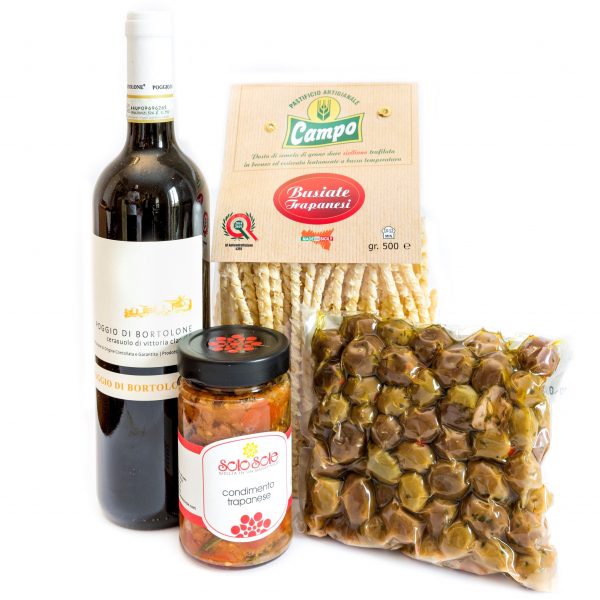 dal Trapanese il sale, l’aglio rosso, il pesto trapanese, il Marsala e lo Zibibbo;