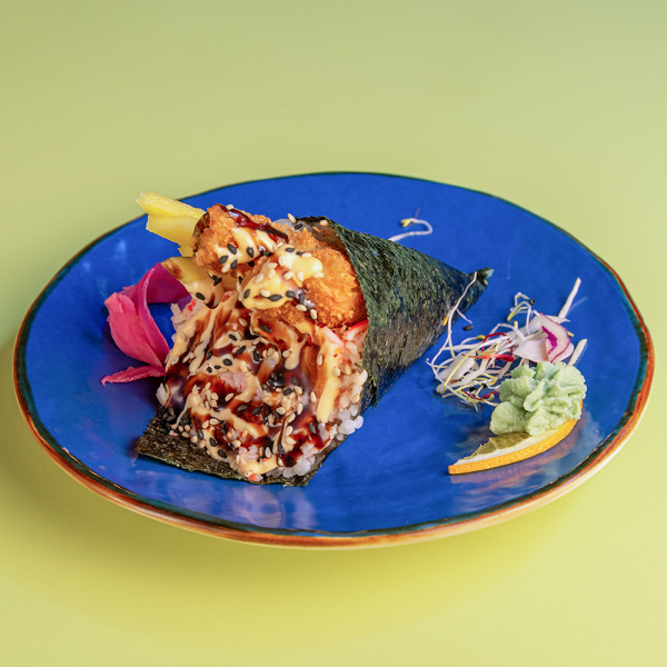 Mazzancolla tropicale impanata, tartare di surimi, semi di sesamo, mango, salsa maionese piccante, uova di pesce volante, salsa teriyaki, salsa maionese giapponese.