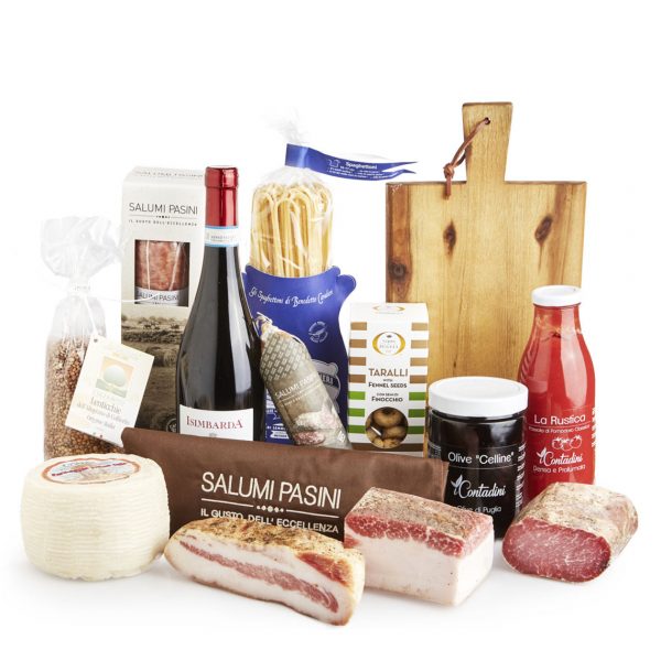 Contenuto Salame Campagnolo stagionato 450g Guanciale stagionato trancio 250g Bresaola di Suino trancio 250g Lardo speziato trancio 300g Cotechino fresco in scatola 500g Formaggio Primo Sale 950g Olive Celline vasetto 550g Passata di Pomodoro La Rustica 500g Spaghettoni Benedetto Cavalieri 500, Tagliere in acacia con manico brandizzato Grembiule da cucina color cacao Lenticchie Colfiorito La Valletta sacchetto 500g Taralli pugliesi con semi di finocchio 150g Vino Bonarda dell’Oltrepò Pavese DOC Isimbarda