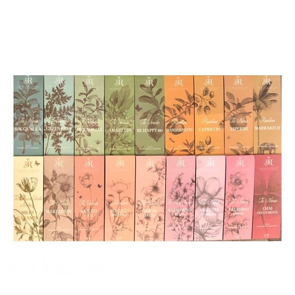 Sono presenti 9 varianti di té puri provenienti dalle varie parti del mondo e 18 tè e rooibos (senza teina) aromatizzati, da poter scegliere. Ogni astuccio "A casa con tè" contiene 15 filtri. Clicca Aggiungi e Scegli gli astucci "A casa con tè" che desideri!
