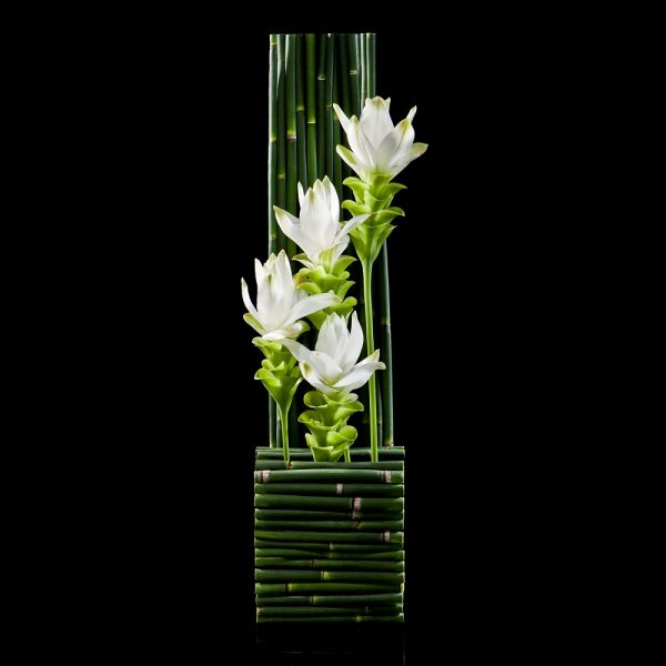 Composizione floreale su vaso in vetro con struttura di snakegrass e fiori di stagione.