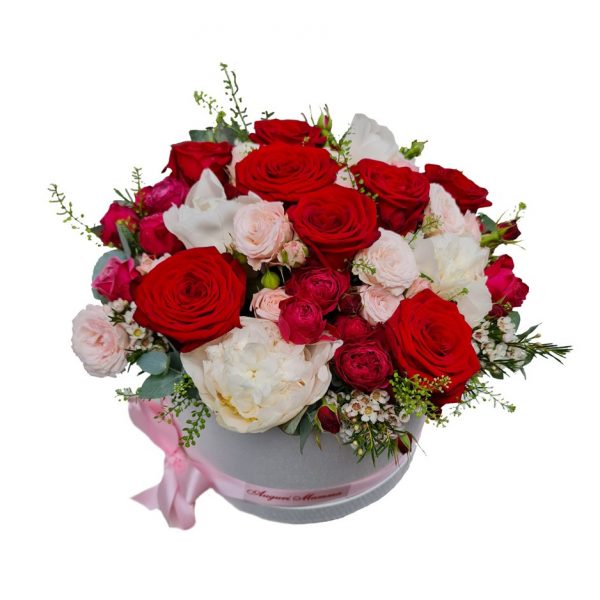 Composizione: Rose, roselline e peonie. Modalità di conservazione: I fiori recisi devono essere conservati lontani da fonti di calore. Per farli durare più a lungo è consigliato aggiungere dell’acqua ogni 2 giorni.