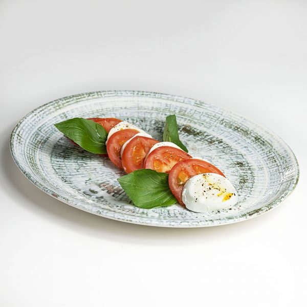La tradizionale Insalata Caprese con Mozzarella di Bufala, Pomodoro, Basilico fresco, consegnata in contenitore biodegradabile.