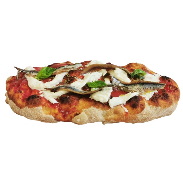 La pizza è disponibile in due formati, lingua intera da 300g e metà lingua da 150g circa. L'impasto è realizzato con farina semintegrale, ad alta idratazione e lunga lievitazione.