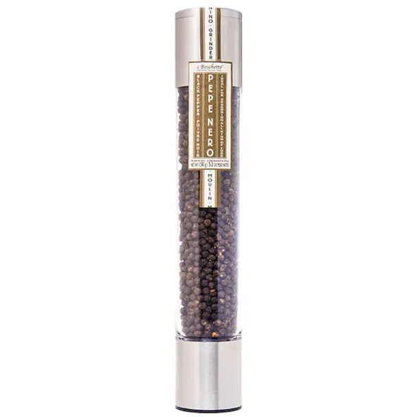 Macinino in metallo, ideato e realizzato da Boschetto, ricaricabile con meccanismo di macina regolabile da grosso a fino, ideale per condire i tuoi piatti preferiti.