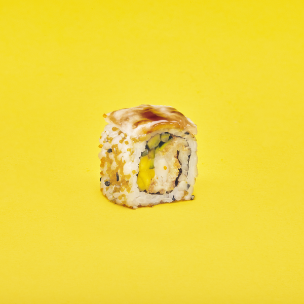 Ricciola oceanica scottata, mazzancolla tropicale impanata, mango, cetriolo, semi di sesamo, uova di pesce volante, salsa teriyaki.