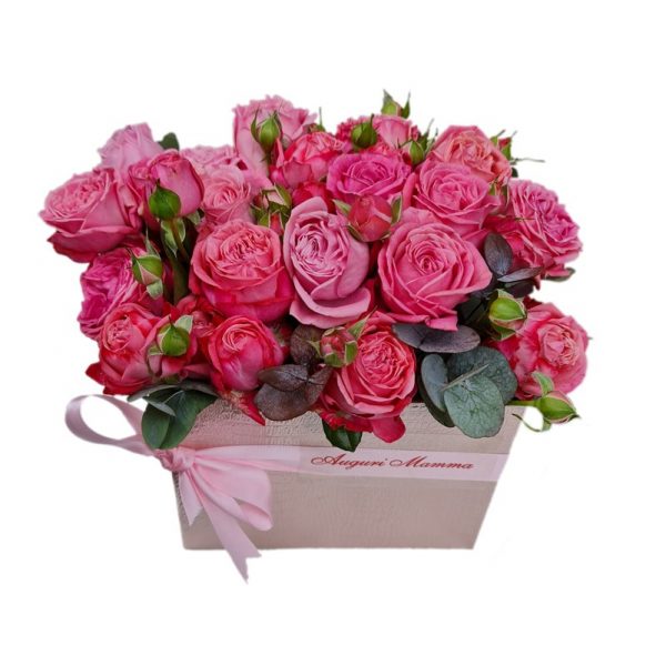 Una bellissima composizione di rose da giardino polyanta realizzata in un elegante box rettangolare di colore rosa antico perlato.