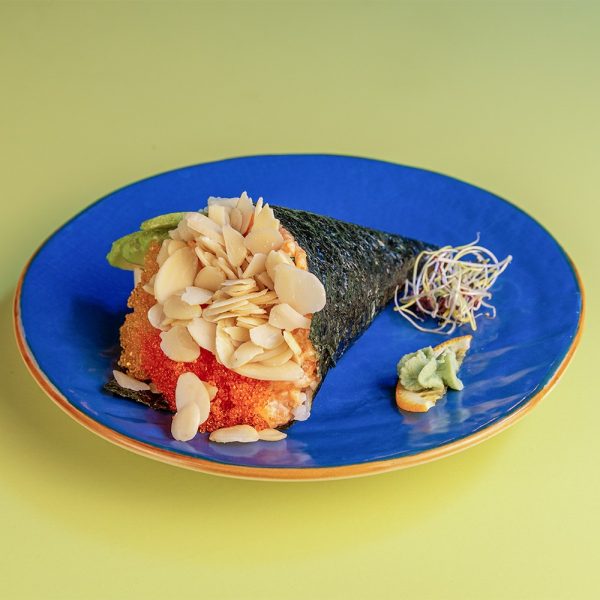 Salmone, avocado, philadelphia, erba cipollina, uova di pesce volante, scaglie di mandorla.