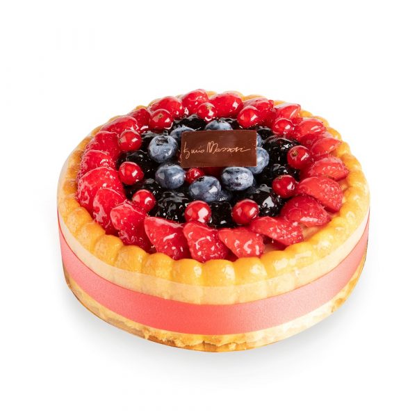 Ingredienti: farina di grano tenero tipo 00, burro, zucchero, miele, sale, bacche di vaniglia, albume d’uovo, limone, baking. Bagna alla fragola: fragoline, zucchero, succo di limone, acqua fragoline. Bavarese vaniglia: panna, latte, tuorli d’uovo, zucchero, amido di riso, bacche di vaniglia, buccia di limone, polpa di vaniglia, gelatina di origine suina. Allergeni: Farina, Latte, Uova, Frutta in guscio.