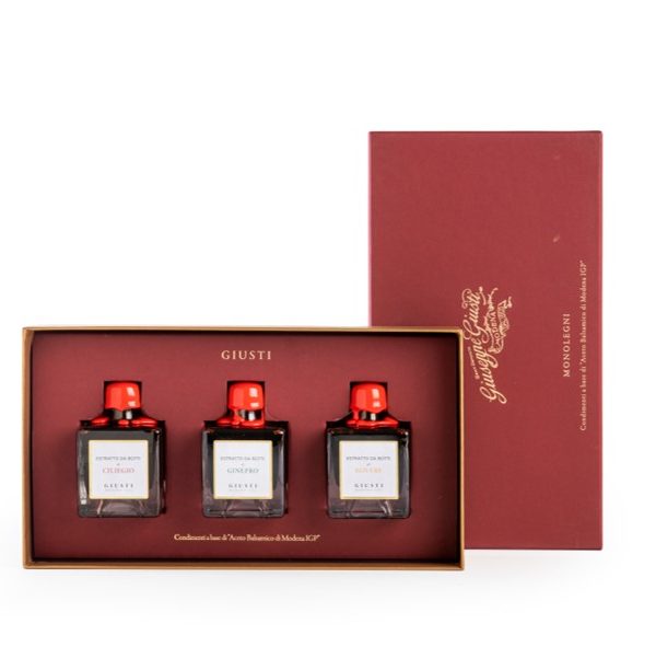 Elegante cofanetto di balsamici aromatizzati e monolegni, per scoprirne le diverse sfumature e abbinamenti. In ciascuno di questi condimenti le caratteristiche distintive di ogni legno: le note vanigliate del rovere, le note aromatiche decise e pungenti del ginepro e quelle speziate e dolci del ciliegio.