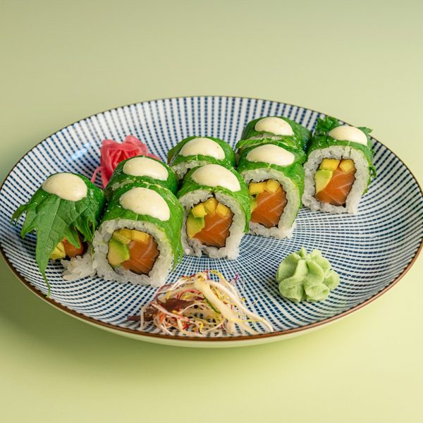 Salmone, mango, avocado, foglie di shiso, salsa maionese al wasabi, salsa ceviche, fiocchi di sale.